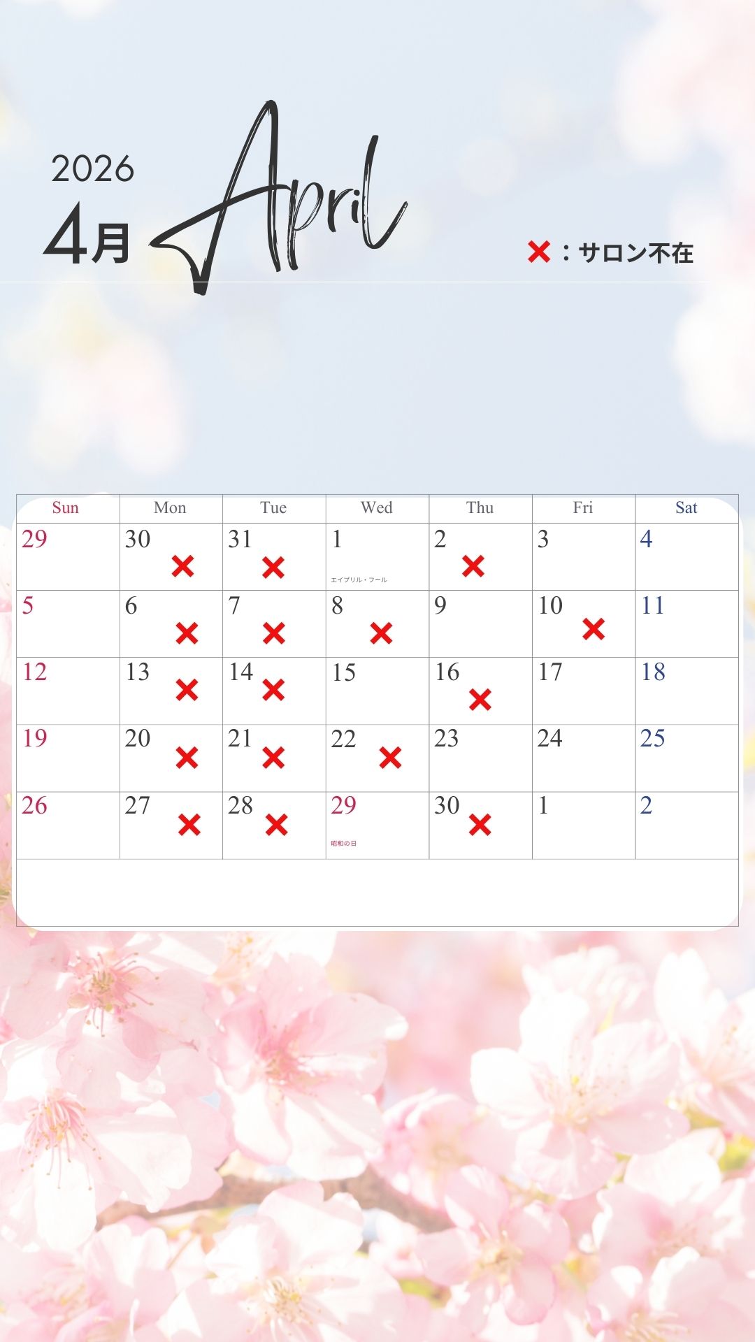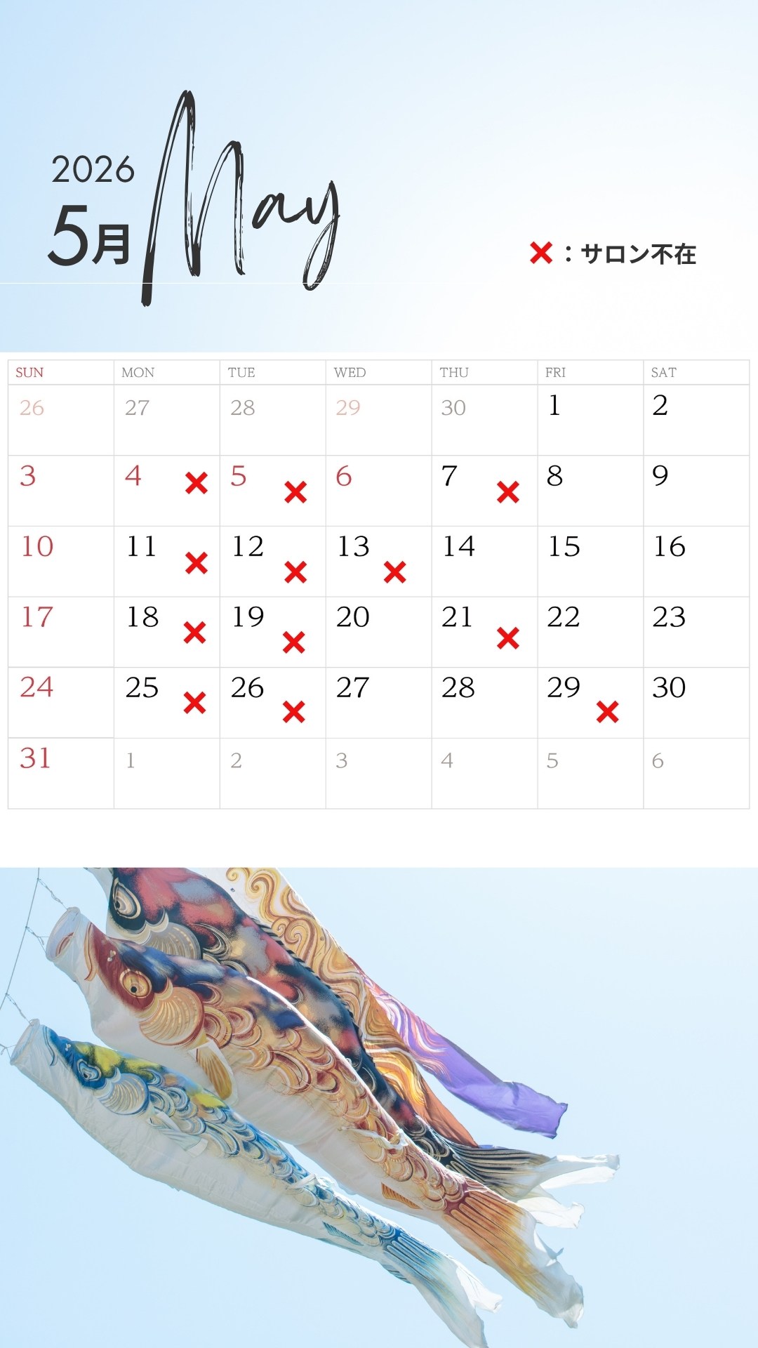 いつもTONI&GUYをご利用いただき誠にありがとうございます。   4月、5月 のスケジュールのお知らせです ×印のところが、サロン不在日となります。 金、土、日曜日は基本、常に出 ...