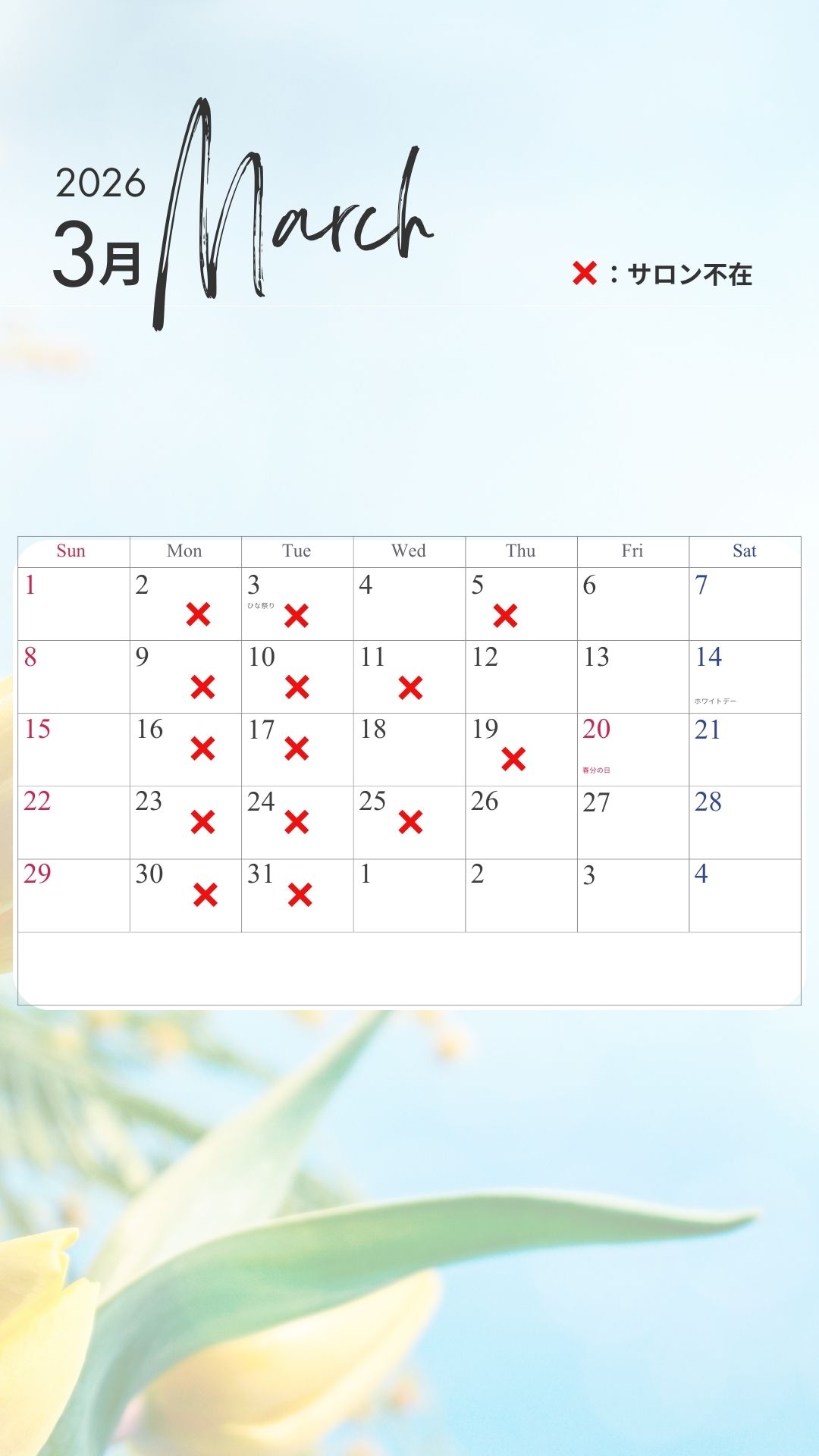 ×印のところが、サロン不在日となります。